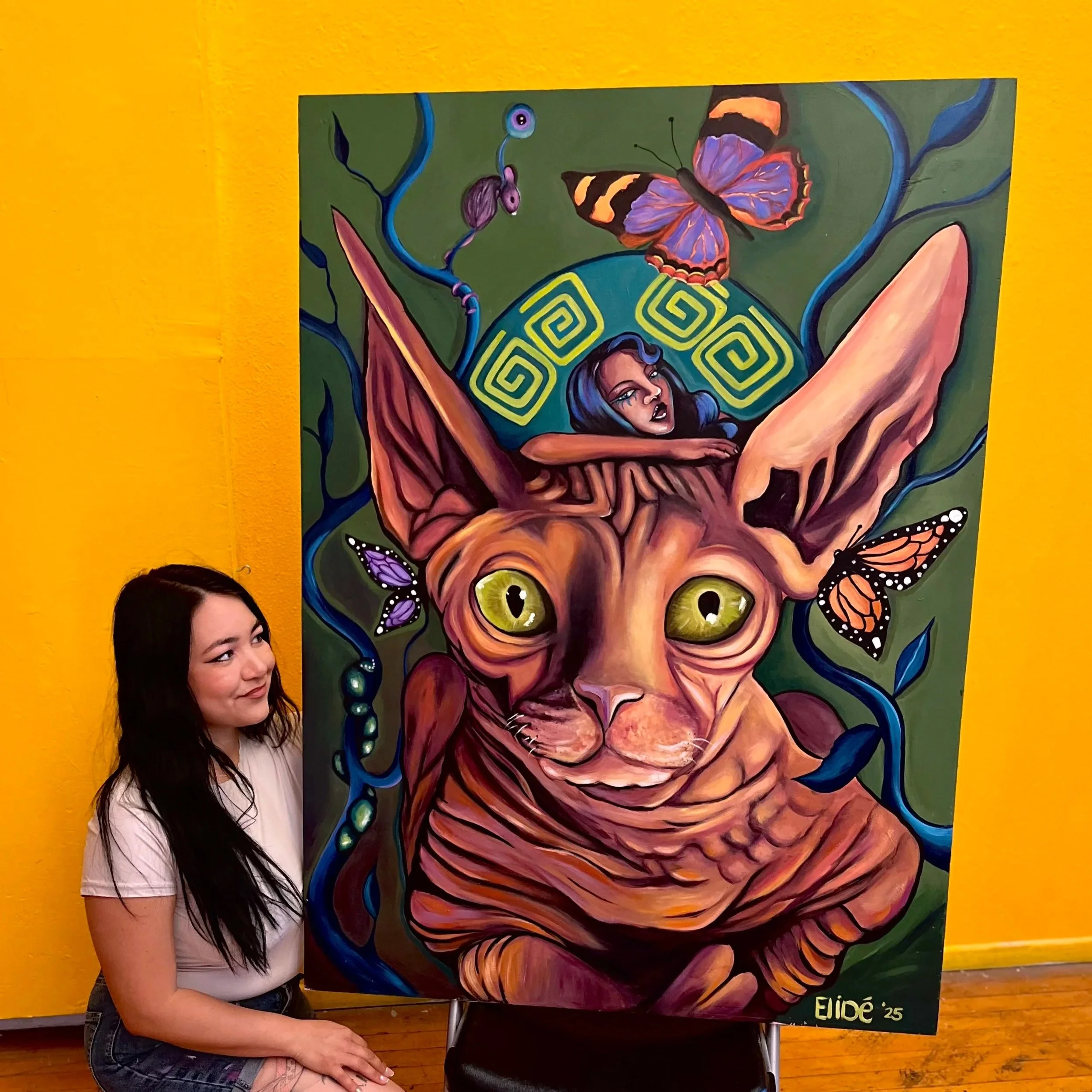 ELIDÉ is a Chicana muralist and painter born in Corona, Ca and raised in Garden Grove and Riverside County. She specializes in paying homage to her Mexican roots, as well as being constantly inspired through world cultures, music, and connection. ELIDÉ’S artwork is grounded in her cultural integrity and knowledge that she has gained throughout life as a way to convey her experiences through bright and colorful personal works of art with acrylic, oil, and spray paint. Each piece is her offering, a way to honor the past, navigate the present, and to create a future rooted in connection to others and self-discovery.